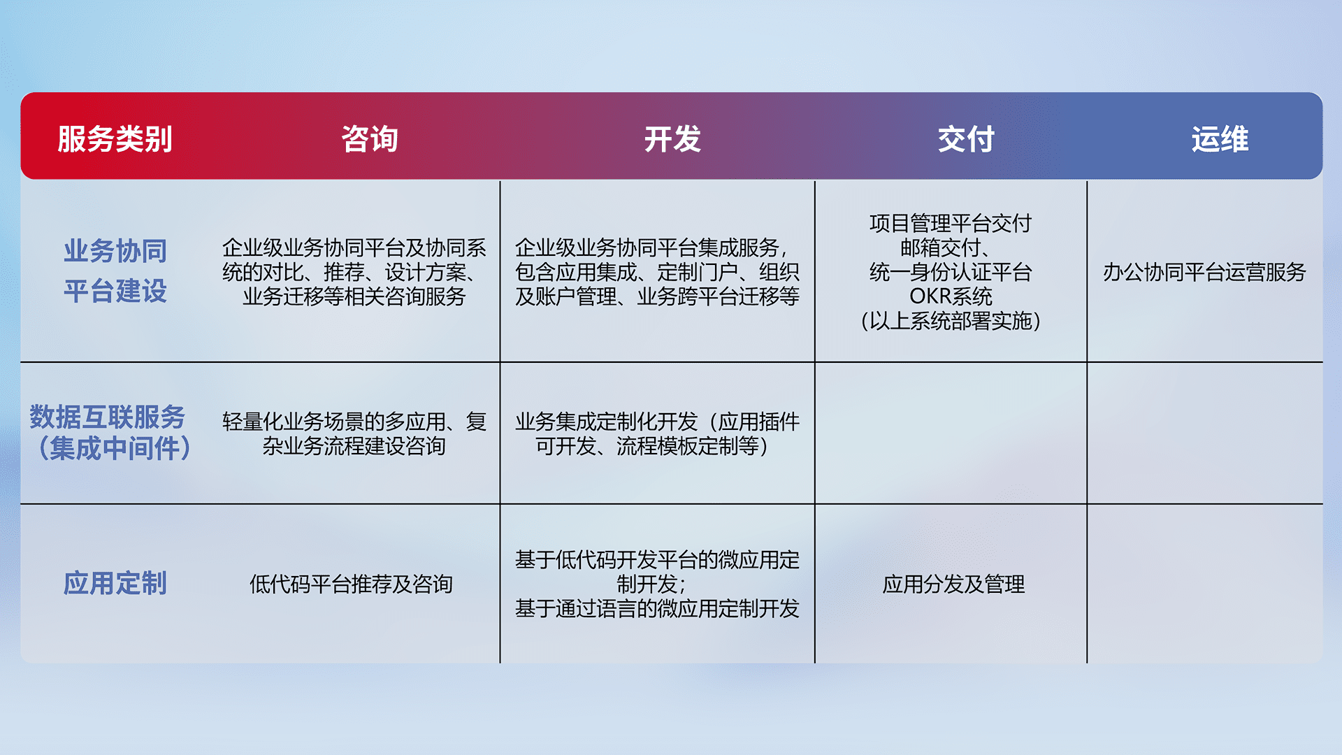 针对钉钉、、、企微、、、、IDaas等平台级产品提供产品的规划、、方案、、交付、、、、定制化开发等服务,,,,实现如统一协同办公、、、、智能客户服务、、混合会议管理、、、智能数据查询、、等业务场景,,实现数字化转型。。